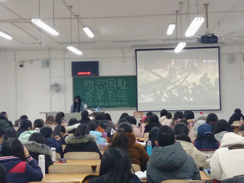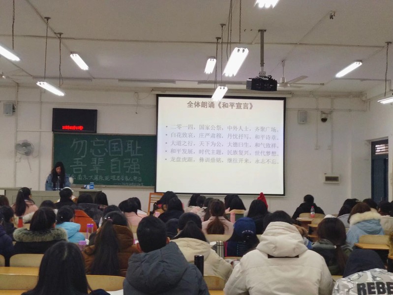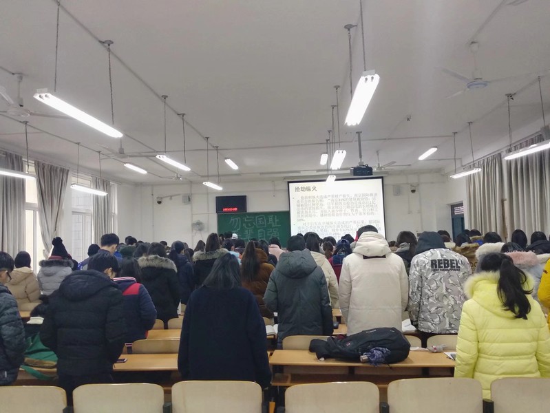 2018年12月13日,第五个南京大屠杀死难者国家公祭日。为贯彻落实中央精神,牢记侵略战争给中国人民和世界人民造成的深重灾难,进一步激发支部成员的爱国主义情怀,实现中华民族伟大复兴而不懈奋斗的正能量,2017级金融学团支部于12月12日在文一区302教室举办“勿忘国耻 吾辈自强”纪念南京大屠杀死难者国家公祭日主题团日活动,活动由团支书程绘桥主持。