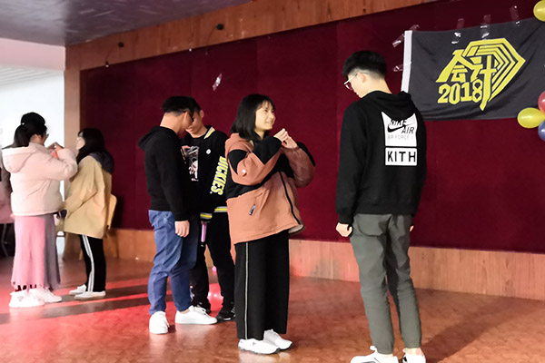 接下来的首轮游戏为千里传音,由2017级和2018级团支部各派出代表参与游戏,通过小组六人相互做出肢体动作猜测成语,缓和两支部初识的尴尬,促进支部成员之间的认识和了解。一轮轮的肢体比划让大家欢笑不已,也让大家体悟到中华成语的博大精深。第二轮的游戏以知识问答为主,问答范围涉及会计专业知识,娱乐文化常识等,经过前一个游戏的暖场,此轮游戏中两支部之间默契度有了明显提高。小组之间的比拼也不相上下,呈现你追我赶的趋势。活动最后由2018级支部成员单独上台献唱,其余支部成员相互交换祝福明信片,自此联谊活动进入尾声。