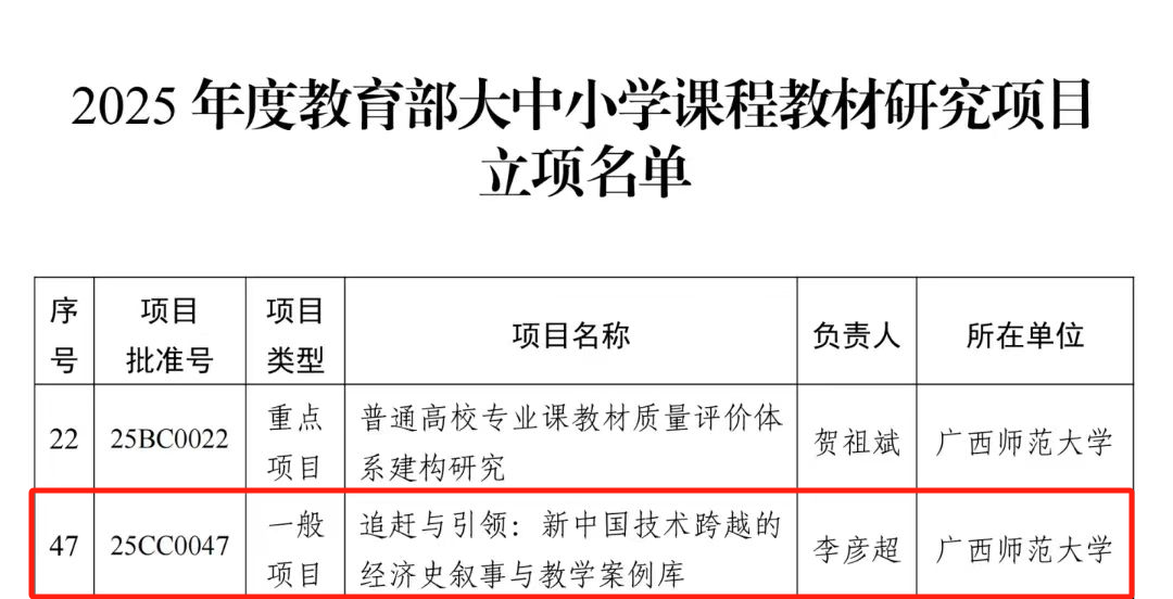 近日,教育部办公厅正式公布2025年度教育部大中小学课程教材研究项目立项名单,全国共48个项目获批。其中,广西师范大学凭借2项立项(重点项目1项、一般项目1项)成为广西全区 3 个获批单位之一,实现学校在该类项目立项上的历史性突破。学院李彦超副教授申报的《追赶与引领:新中国技术跨越的经济史叙事与教学案例库》成功入选一般项目,为学校此次重大突破贡献了经管力量。