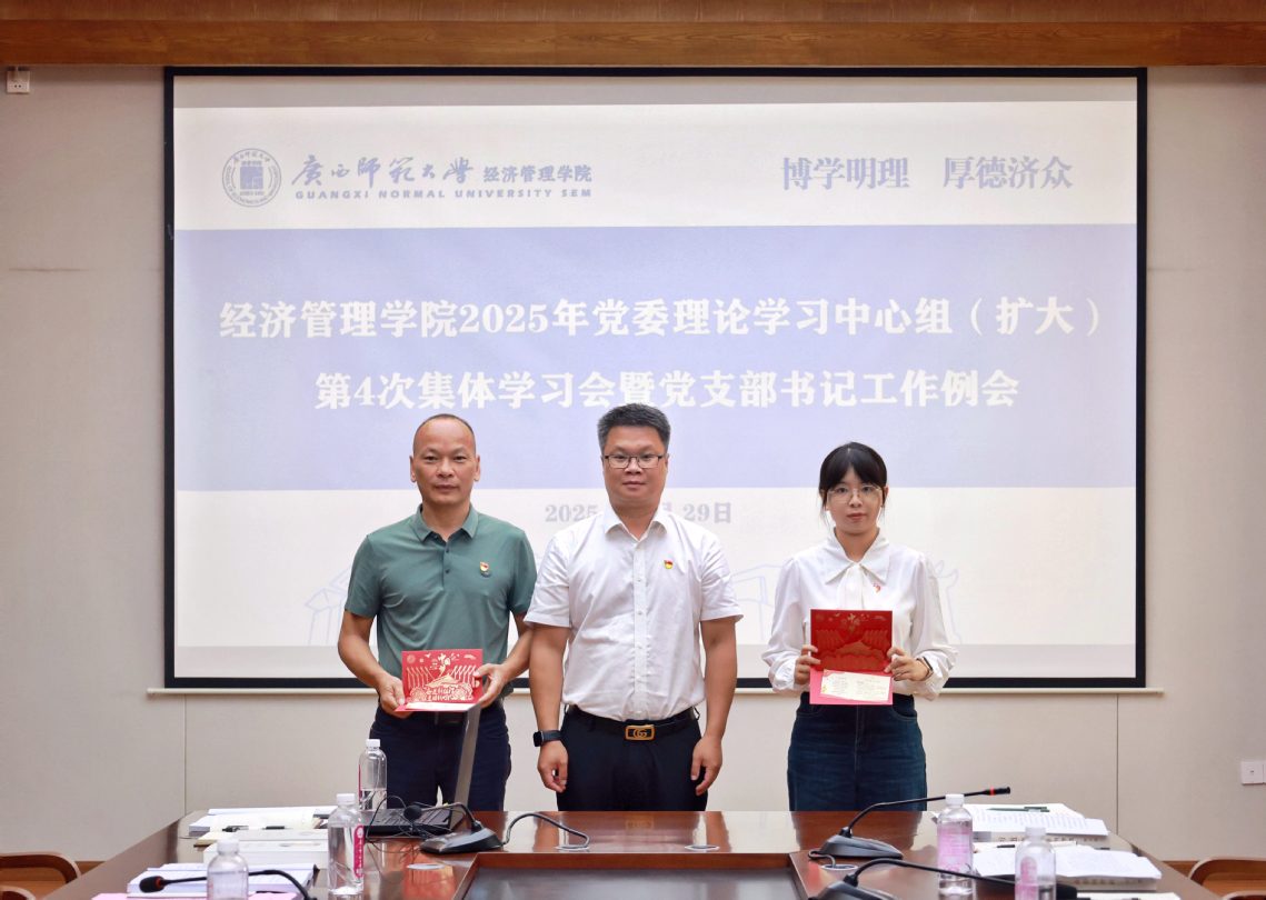 9月29日上午,经济管理学院在雁山校区起文楼第四会议室召开党委理论学习中心组(扩大)2025年第4次集体学习会暨党支部书记工作例会。学校宣传思想和意识形态工作领导小组成员、学校发规处处长、博士生导师苏曦凌教授旁听指导;学院党政领导班子成员、党委委员、纪委委员、院长助理和各党支部书记、办公室主任、工会主席、团委书记、专职组织员、行政教辅人员、辅导员、院聘人员以及学生党员代表参加会议。会议由学院党委主要负责人主持。