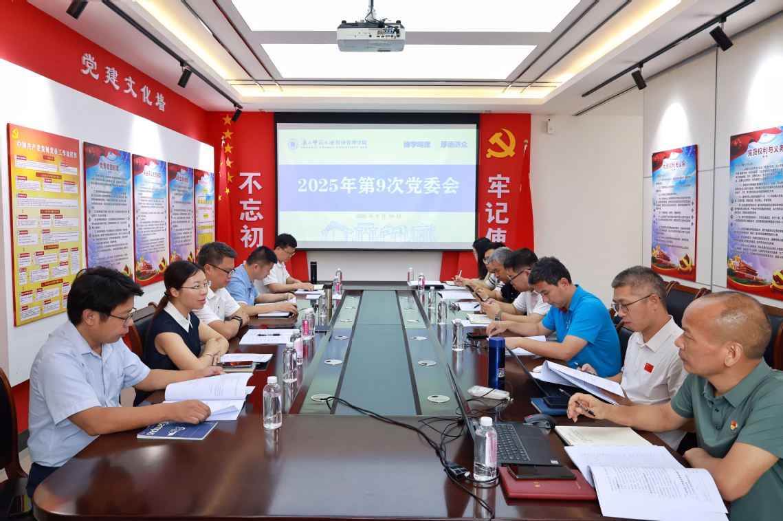 9月29日上午,经济管理学院在雁山校区起文楼北楼320会议室召开2025年第9次党委会,认真学习习近平总书记给全国特岗教师代表重要回信精神、习近平总书记在纪念中国人民抗日战争暨世界反法西斯战争胜利80周年大会上的重要讲话精神、习近平总书记关于加强作风建设的重要指示精神和中央党的建设工作领导小组会议精神、《习近平谈治国理政》第五卷丰富内涵和精神实质,研究学院贯彻落实工作,持续推动高质量发展。学院党员院领导、党委委员出席会议。非党员院领导、院长助理、办公室主任、团委书记、专职组织员列席会议。会议由学院党委主要负责人主持。
