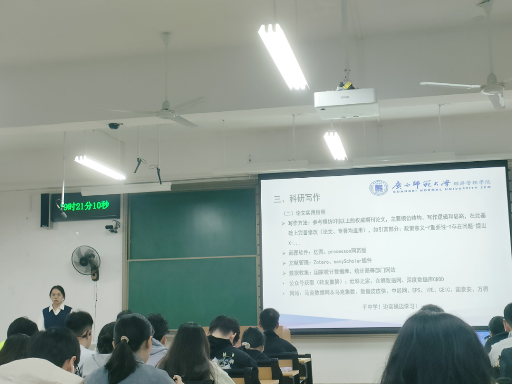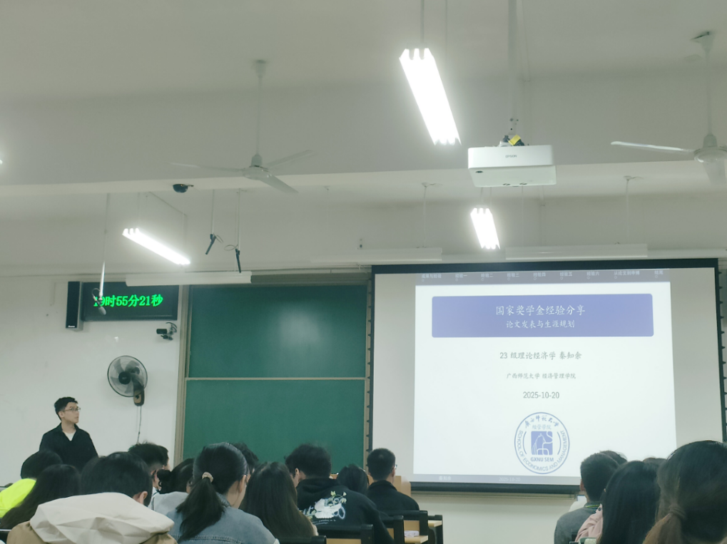 为进一步帮助研究生新生明确职业生涯规划,树立正确的学术理想与就业观念,2025年10月20日晚,经济管理学院在雁山校区理科楼3-206教室举行优秀学子学习、成长经验交流会。本次活动由学院研究生辅导员主持,2025年获国家奖学金学院推荐资格的优秀学生代表做专题分享,雁山校区全体研究生新生参加。
