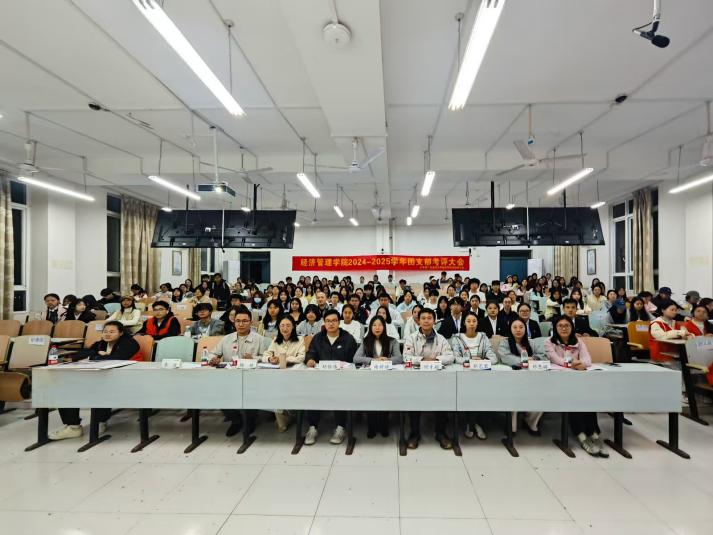 10月24日,经济管理学院于文四区401教室举行2024-2025学年团支部考评大会。学院分管学生工作负责人、团委负责人、专兼职辅导员以及校团委代表、各兄弟学院代表等出席,近200名学生代表参与。
