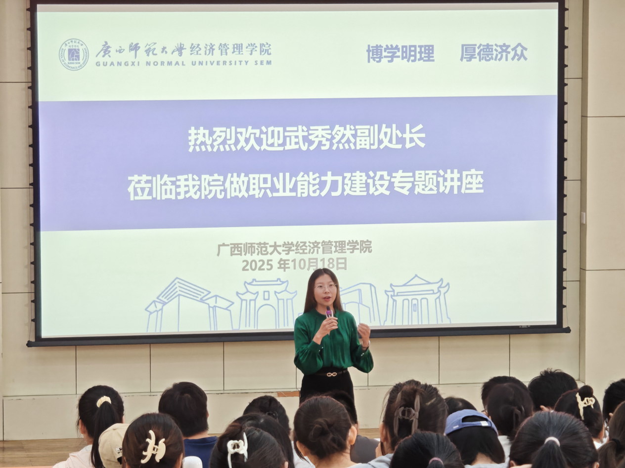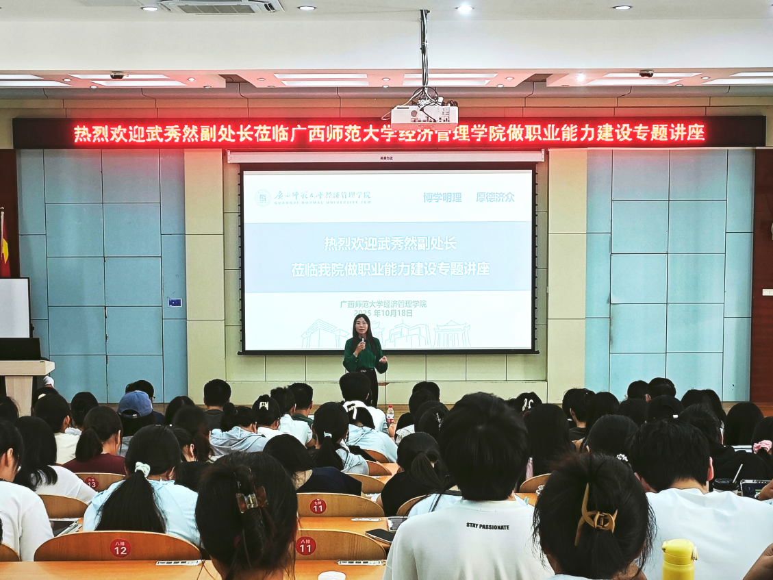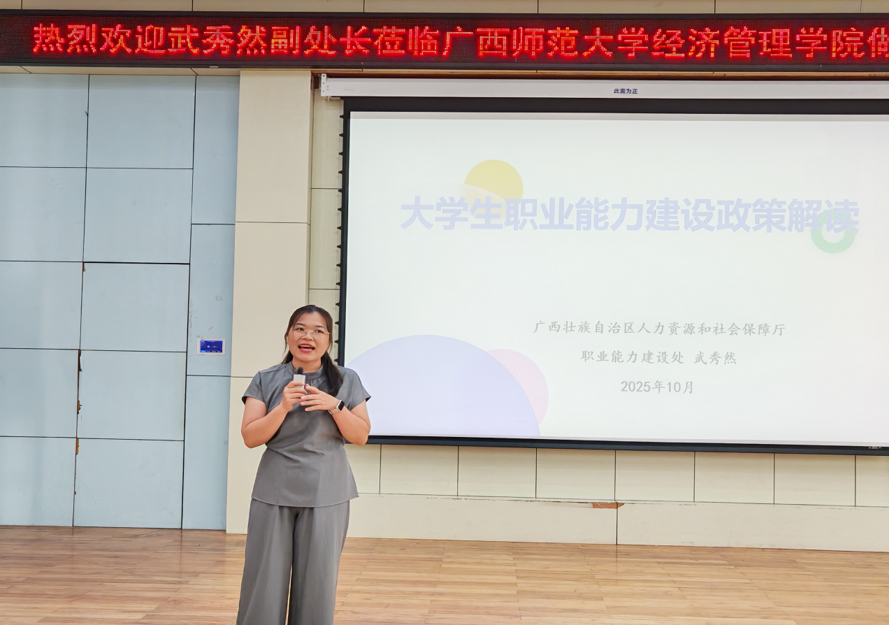 为帮助学生深入理解国家就业政策,科学规划职业发展方向,提升就业能力。10月18日下午,经济管理学院在文二219举办了2026届毕业生职业能力建设专题专题讲座,此次讲座由广西壮族自治区人力资源和社会保障厅武秀然副处长主讲,学院分管学生工作负责人主持,学院毕业班辅导员、2026届本科生和研究生聆听报告。