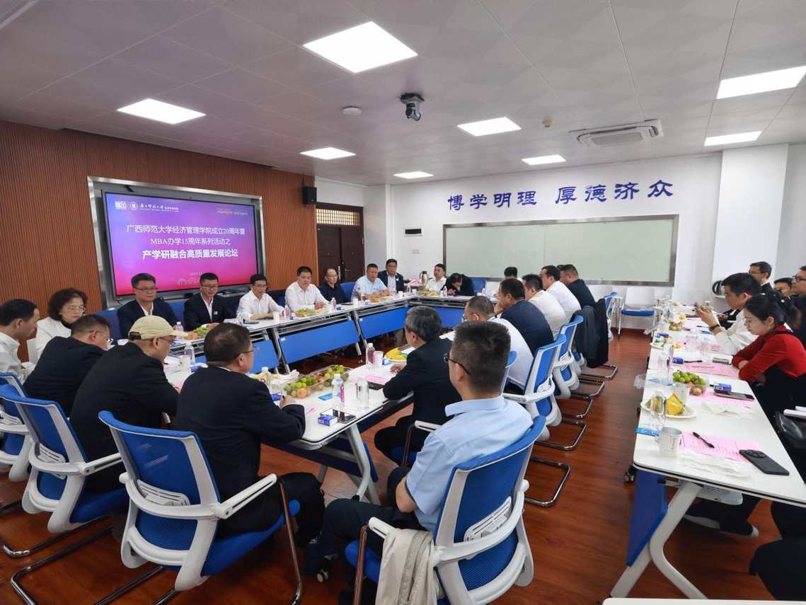 为庆祝广西师范大学经济管理学院成立20周年暨MBA办学15周年,11月8日下午,经济管理学院在育才校区第二文科楼综合楼715会议室成功举办产学研融合高质量发展论坛。学院党政领导班子成员、原院领导代表、院长助理、教工党支部书记、系主任、教研室主任、院友代表、企业嘉宾40余人共商产教融合与高质量发展路径。论坛由学院分管行政工作主要负责人主持。
