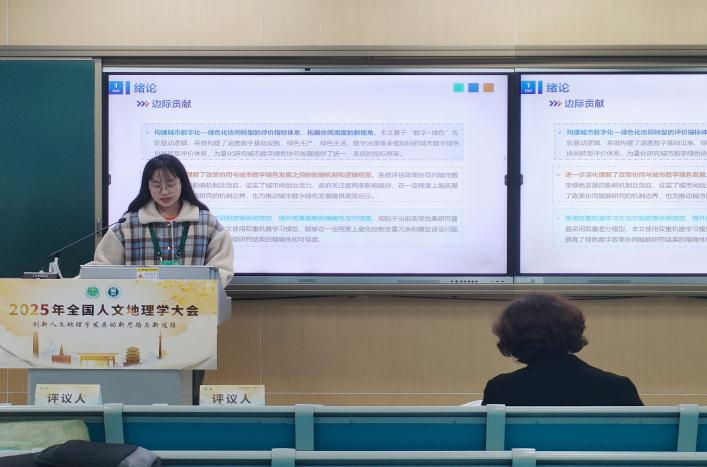在“城市地理学理论创新与发展”分会场中,经济管理学院戴其文老师指导2024级硕士研究生刘熙薇、吴米琪完成的合作论文《政策协同何以有效赋能城市数字绿色转型》入选会议并作专题报告。该研究从政策协同视角切入,系统探讨了绿色金融改革创新试验区与“宽带中国”试点政策能否产生协同效应,更有效推动城市数字绿色转型,具有较强的理论价值与现实意义,报告内容获得与会点评专家的高度评价。