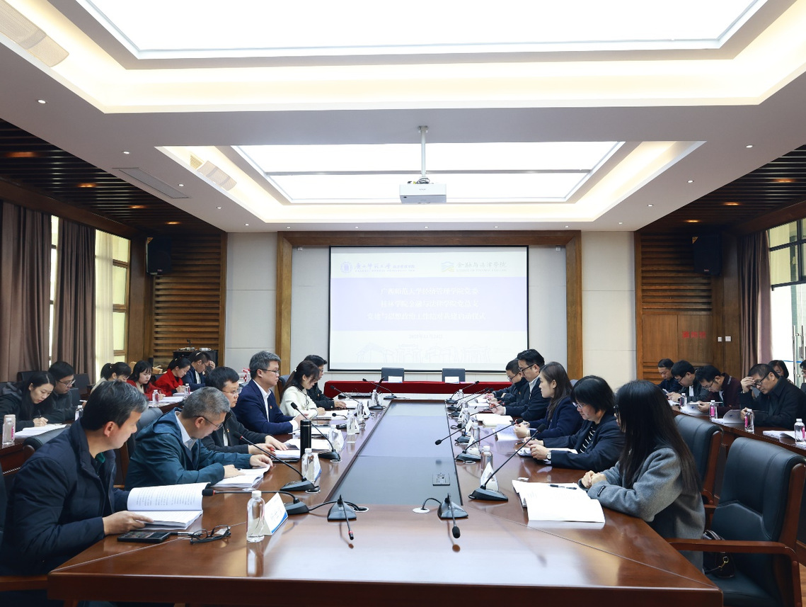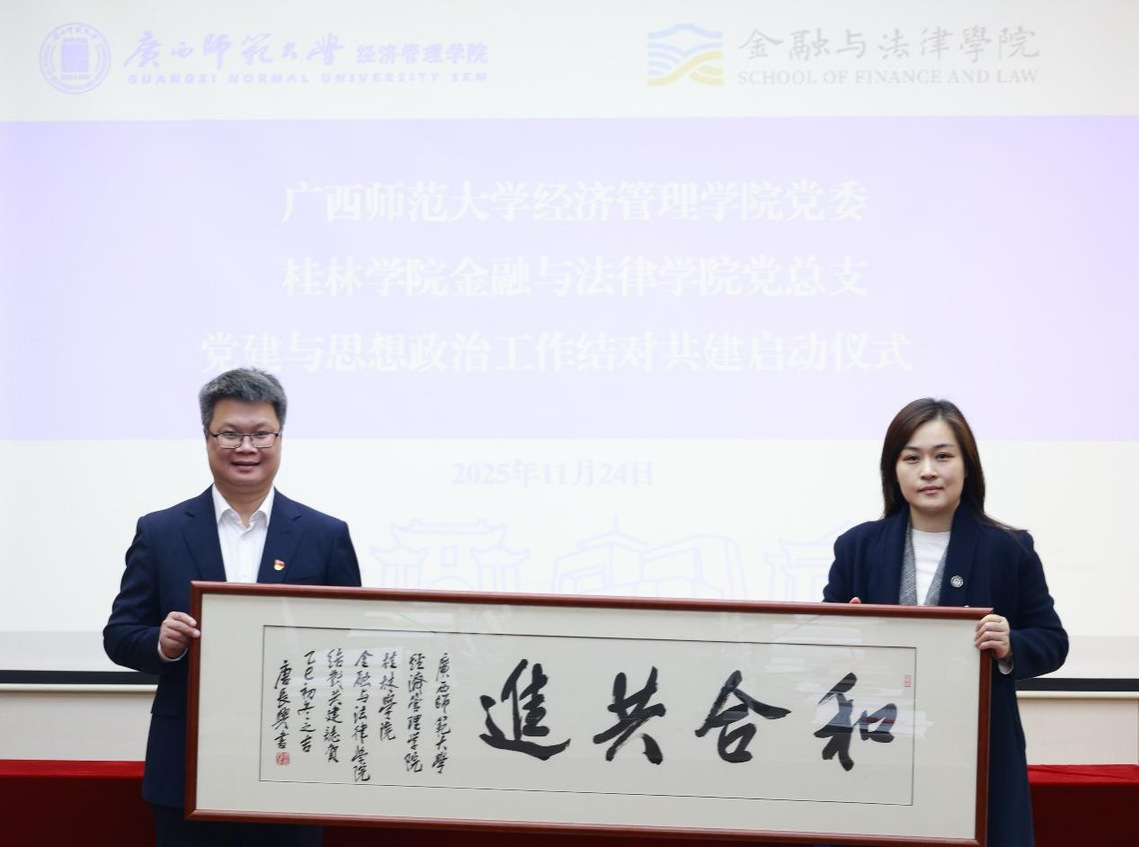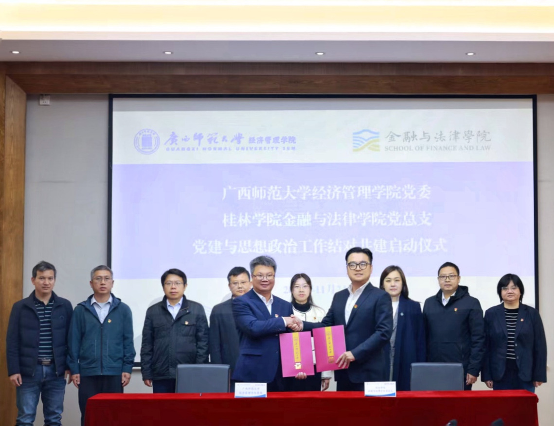为深入学习贯彻习近平新时代中国特色社会主义思想,认真落实新时代党的建设总要求和新时代党的组织路线,以高质量党建引领高水平育人,11月24日上午,广西师范大学经济管理学院党委与桂林学院金融与法律学院党总支在雁山校区起文楼第四会议室举行了党建与思想政治工作结对共建启动仪式。参加会议的有经济管理学院党政领导班子成员、党委委员、纪委委员、院长助理、系主任和党支部书记、行政教辅人员、辅导员、院聘人员,桂林学院金融与法律学院党政领导班子成员、党总支委员和党支部书记。双方齐聚一堂,共商党建与思想政治工作结对共建,共话高质量发展新蓝图。会议由学院学生工作负责人主持。