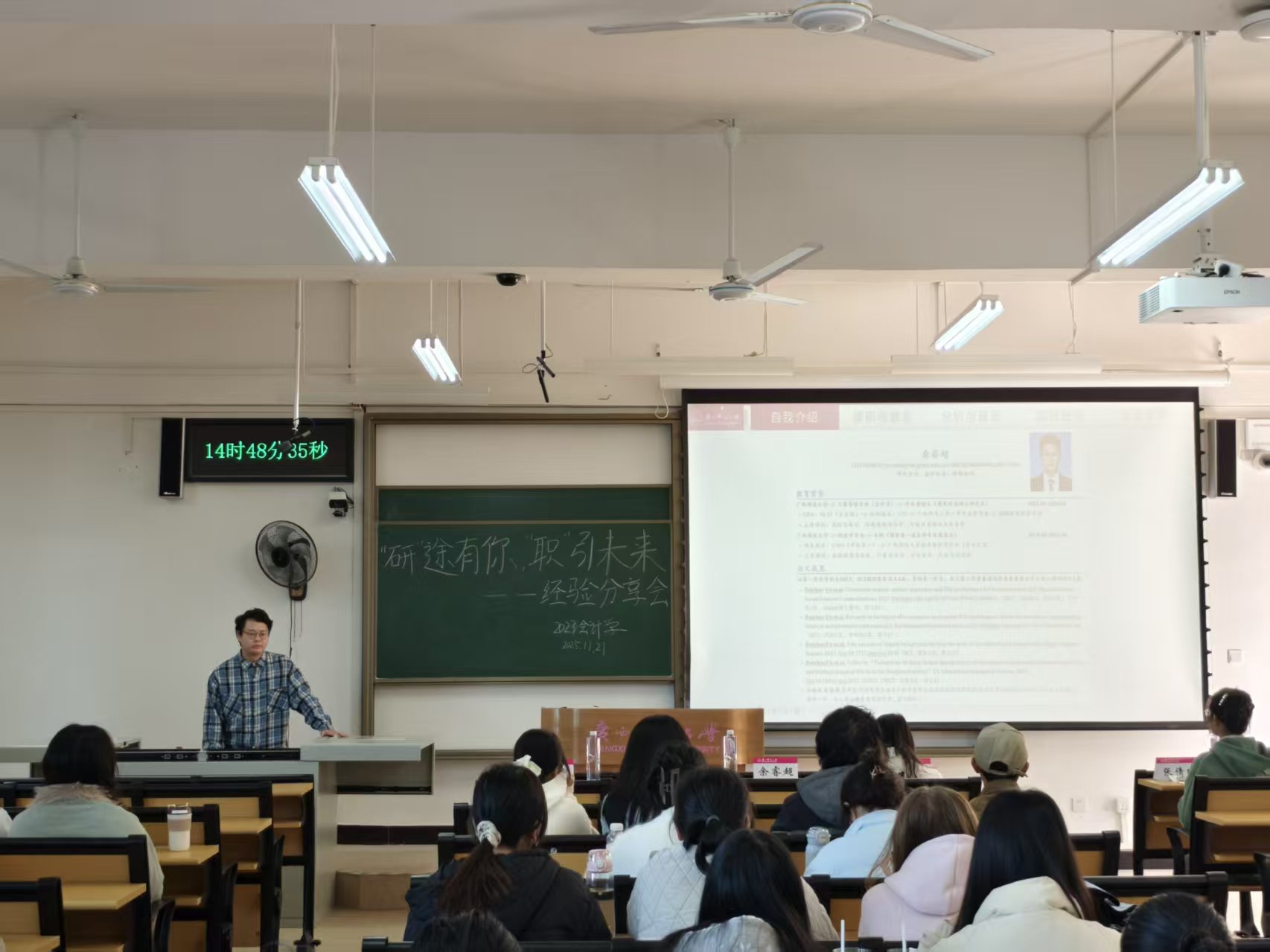 为帮助同学们明确未来发展方向,11月21日,23级会计专业于理三205教室举办“研途有你,职引未来”经验分享会。本次活动特邀余睿超、马荣华、张倩琳三位研究生,分别围绕志愿服务、学术科研与考研备考等方向展开分享,班主任汤颖跃老师以及专业全体同学参加。