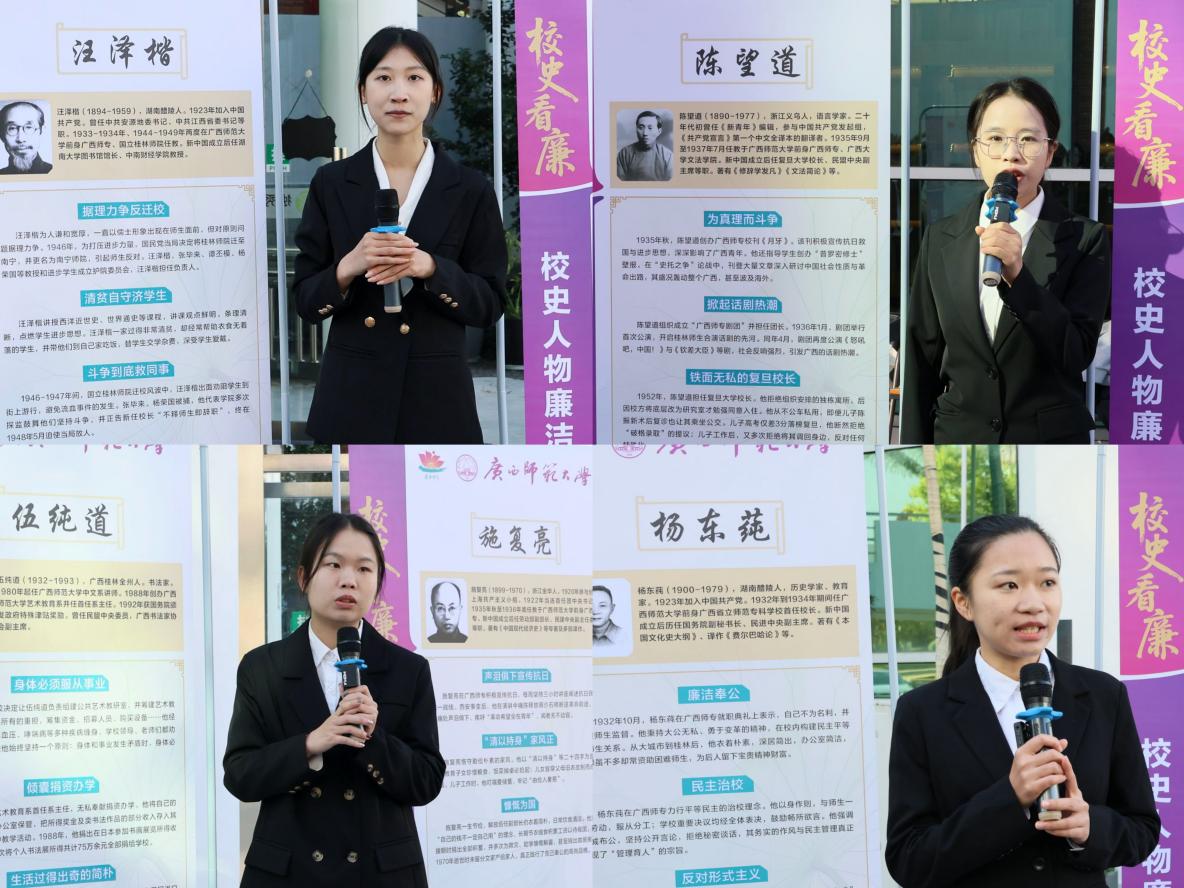 为深入贯彻落实自治区党委关于清廉广西建设新部署新要求,结合七个“清廉单元”建设和第二十二个国际反腐败日的宣传教育要求,推动“清廉师大”建设,引导广大师生崇廉尚洁、知行合一,11月29日,在“雁园清风”讲堂系列活动开展之际,经济管理学院在独秀书房门口开展校史人物廉洁故事宣讲活动。活动由学院分管学生工作负责人主持,学院校史文化育人宣讲团五位讲解员宣讲,宣讲团全体成员、党员代表、团员代表及学校各社团代表参加。