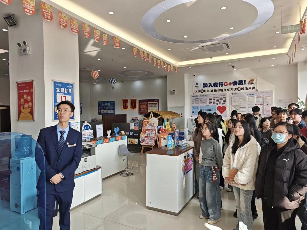 桂林银行雁山支行营业部负责人重点推介四级服务网络,详解“1+6”乡村金融经验做法,同时聚焦乡村振兴具体举措进行说明。师生就网点运营及人才建设等议题与工作人员展开研讨。