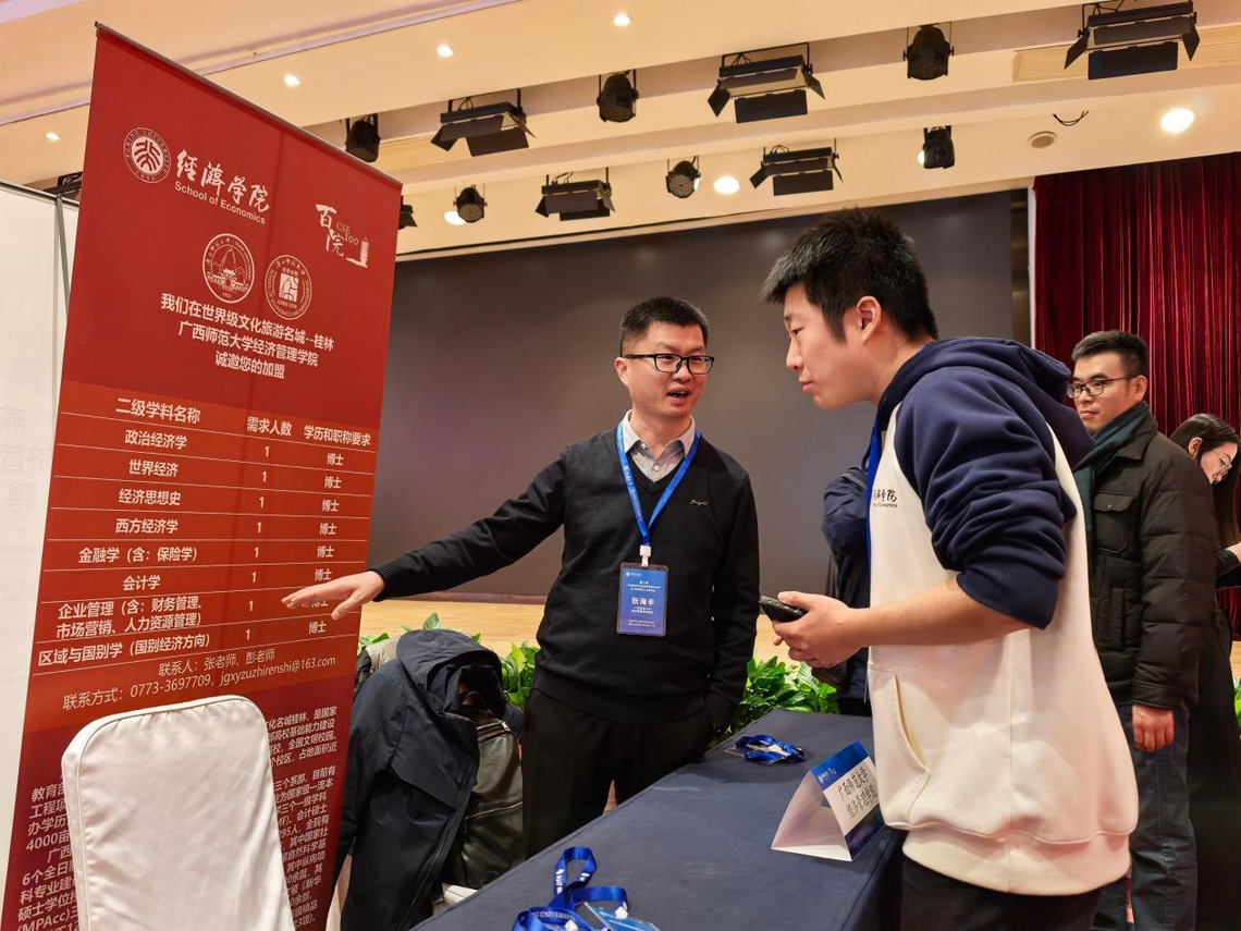 12月13日下午,论坛在北大博雅国际酒店举办“百所经院人才招聘会”。招聘会吸引了海内外3000余名博士生参加,他们与来自全国130所高校及科研机构的招聘单位负责人进行了面对面深度洽谈。广西师范大学经济管理学院党政主要负责人与来自北京大学、中国人民大学、中央财经大学等高校的博士毕业生和博士后进行了全面接洽,并收到国内外名校优秀应聘者的简历20余份,为2026年学院优秀师资的招聘奠定良好基础。