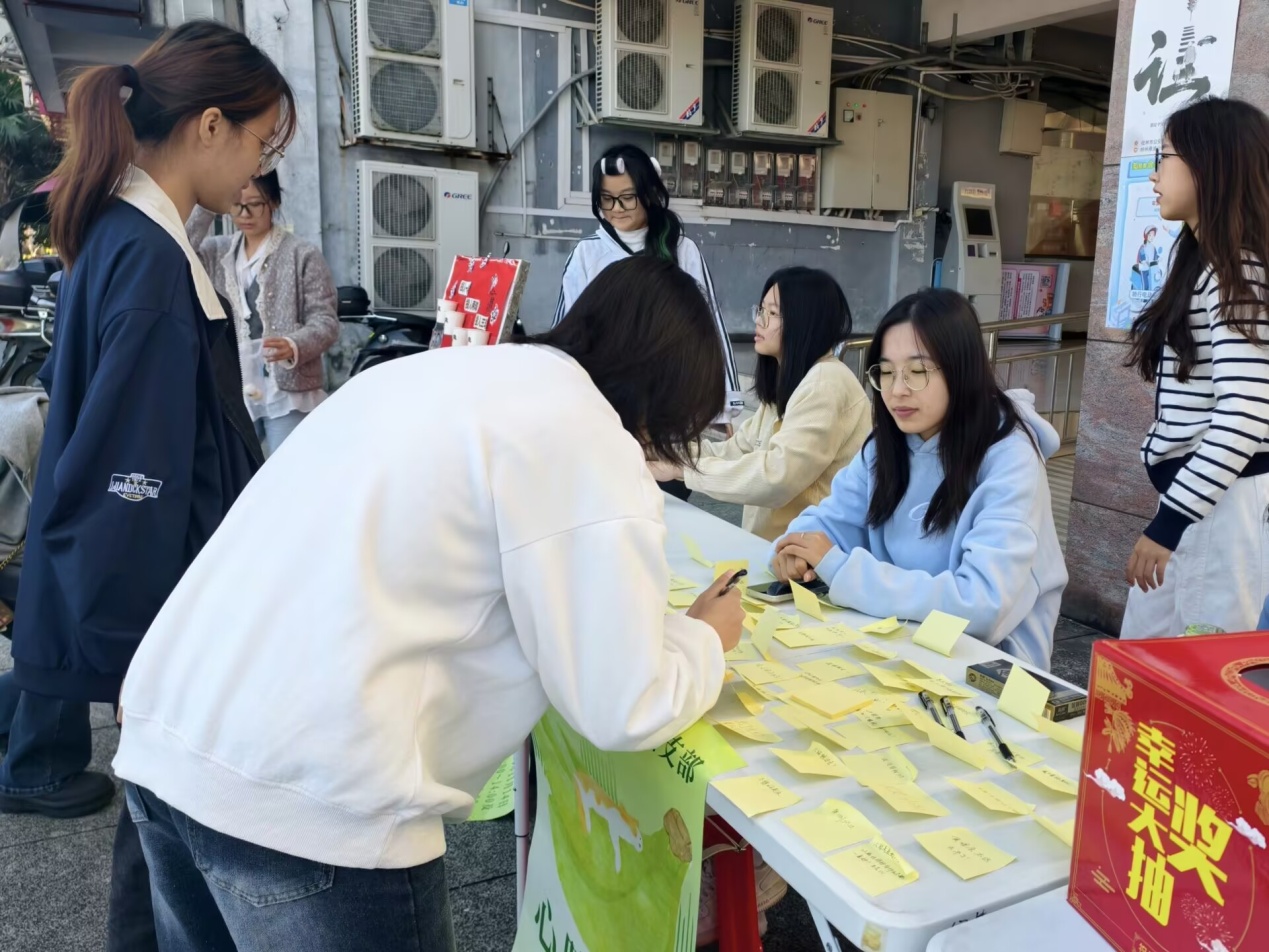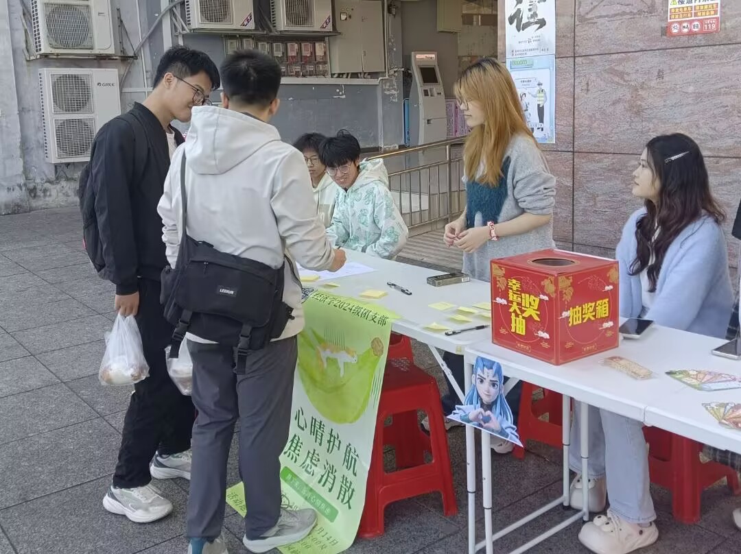 为守护学生心理健康,培育阳光心态,2025年11月14日,经济学2024级团支部在大学生创业园前开展“心晴护航,焦虑消散”心理健康志愿服务活动。
