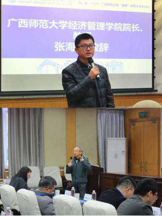 论坛开幕式中,广西师范大学经济管理学院行政主要负责人代表学院对远道而来的嘉宾、汇报人和参会师生表示热烈欢迎。他强调“暮桥”论坛作为研究生学术成长的重要载体,旨在为青年学子搭建思想碰撞、成果共享的桥梁,鼓励大家以学术为媒,探索前沿、深耕细作。随后,广西师范大学学报(哲学社会科学版)副主编刘文俊致辞,他肯定了论坛的学术价值与影响力,期待更多优质研究成果通过学术平台传播推广,助力学科发展与人才培养。