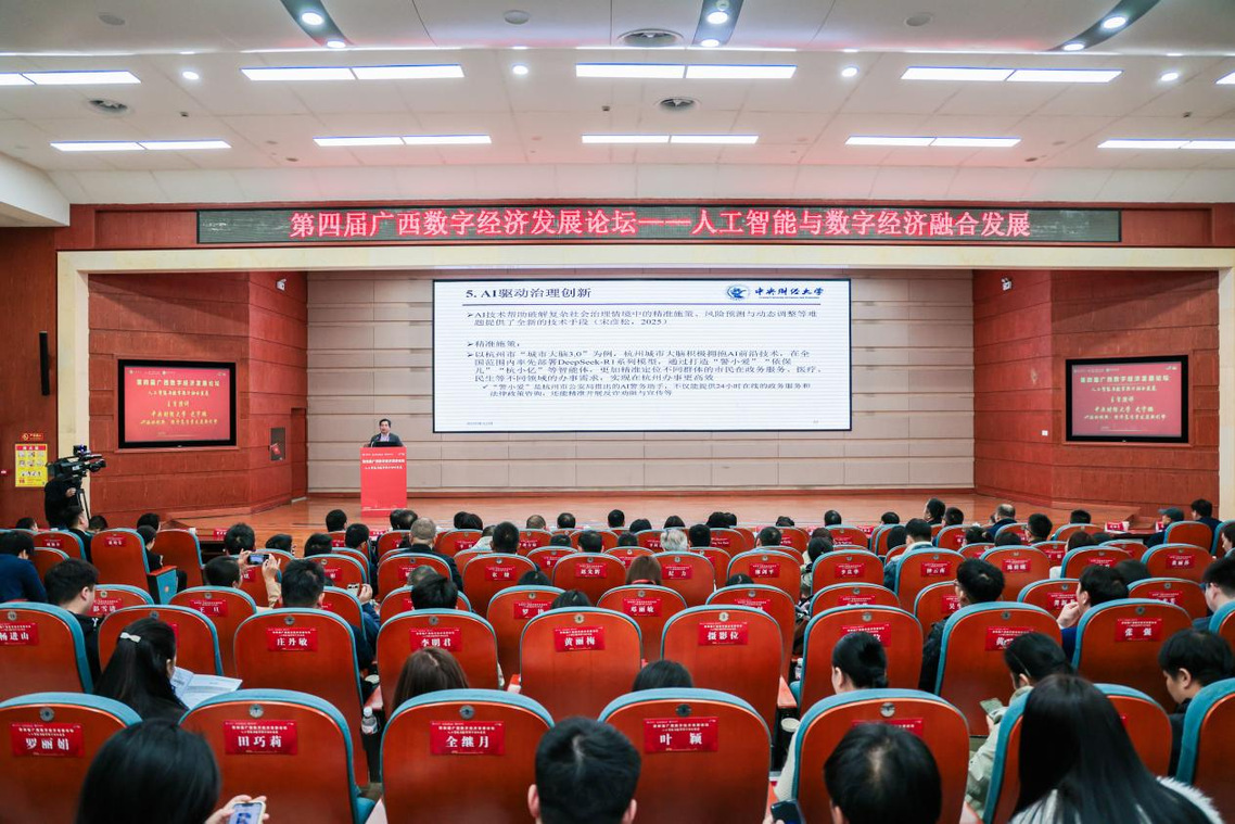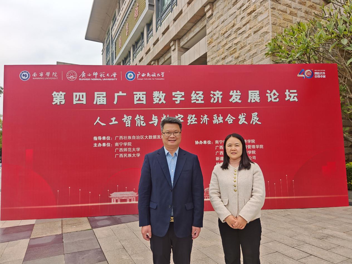 第四届广西数字经济发展论坛于12月27日在南宁学院成功举办,主题为“人工智能与数字经济融合发展”。论坛在广西壮族自治区大数据发展局指导下,由南宁学院、广西师范大学、广西民族大学联合主办,广西师范大学经济管理学院等单位共同协办。来自国内外高校、政府部门、科研机构及企业的两百余名代表参会。广西师范大学经济管理学院党委主要负责人、教师代表罗艳副教授受邀参会。