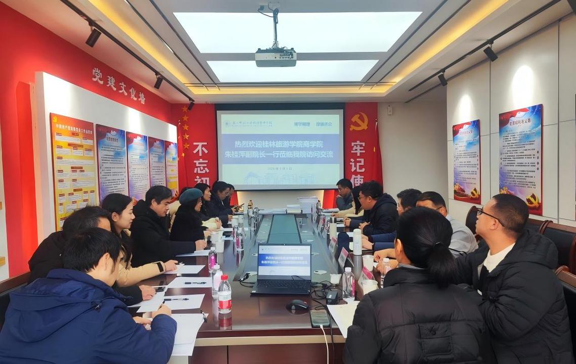 2026年1月5日,桂林旅游学院商学院朱桂萍副院长一行到经济管理学院开展访问交流活动。经济管理学院分管教学副院长、各教研室主任及本科教学秘书参加交流座谈会,双方就本科教育教学审核评估相关工作的组织和安排开展深入交流。
