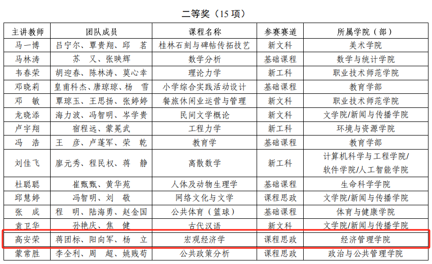 在广西师范大学举办的第六届教师教学创新大赛中,经济管理学院高安荣和张春雨2位老师凭借扎实的教学功底与创新的教学设计脱颖而出,分别荣获二等奖和三等奖。经济管理学院组织得力、参赛踊跃且成果显著,成功获评“优秀组织奖”。