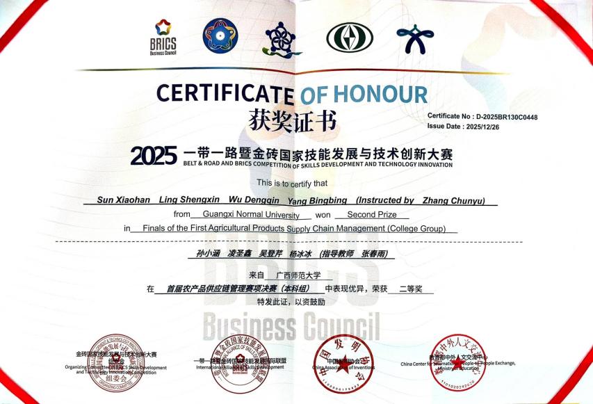 2025年12月23日,广西师范大学认定的二类竞赛——“一带一路”暨金砖国家技能发展与技术创新大赛之首届农产品供应链管理赛项全国决赛圆满收官。由广西师范大学经济管理学院张春雨老师悉心指导,孙小涵、凌圣鑫、吴登芹和杨冰冰四位同学组成的莲雾跨境供应链方案设计团队,凭借专业素养和方案设计,在比赛中表现突出,荣获全国总决赛二等奖。