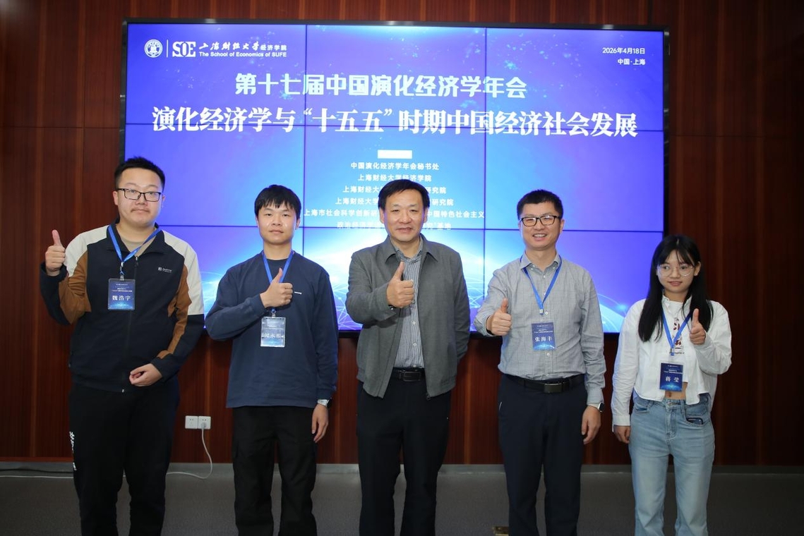 2026年4月18日,由中国演化经济学年会秘书处、上海财经大学经济学院、上海财经大学马克思主义研究院、上海财经大学习近平经济思想研究院、上海市社会科学创新研究基地“新时代中国特色社会主义政治经济学话语体系创新研究”基地共同主办的第十七届中国演化经济学年会在上海财经大学顺利召开。来自中国社科院、清华大学、中国人民大学、浙江大学、南京大学等知名高校、科研院所的专家学者和师生100余人出席本届年会,共同围绕“演化经济学与‘十五五’时期中国经济社会发展”这一主题进行深入探讨。广西师范大学经济管理学院张海丰教授率队应邀参加本届年会,并作题为《算力陷阱:Al技术轨道的高能耗方向及其演化路径》的主旨演讲。此外,2023级硕士研究生何永根的《长波周期、大国竞争与中国创新赶超:基于康德拉季耶夫长波视角的分析》以及2024级硕士研究生魏浩宇的《我国扩大内需的战略选择:从内卷式竞争到熊彼特竞争》这两篇论文也入选年会,两位作者分别在分会场进行了汇报。